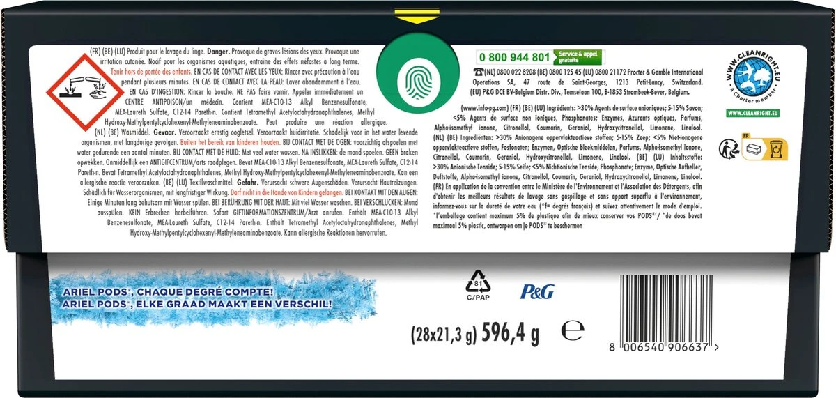 - Ecoclic kartonnen doos: Zorg voor minder plastic met Ariel All in 1 Wasmiddel Pods, nu in een recyclebare kartonnen doos die gemaakt is met 70% gerecyclede vezels en maximaal 5% plastic